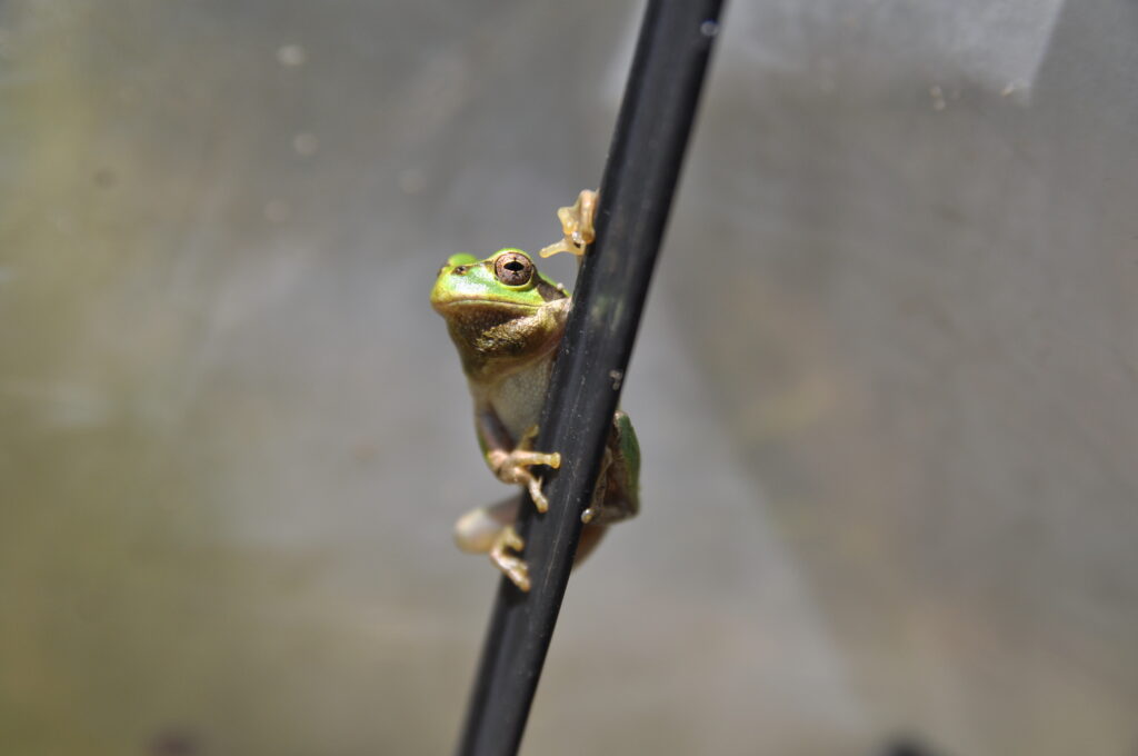 明確な主題であるカエルが縦の棒を掴みながら、こちらに左目を向けている。中央に主題が置かれており、その周辺の背景は曖昧で、目立った情報を持っていない。これがどこなのか、はっきりとはわからない。しかしそれは関心の埒外にあり、カエルの存在、その姿勢が持つ生命的な躍動感を強調することに狙いがある。主題が背景から浮き上がっているのは、被写界深度が浅いためであり、ゲシュタルトでいうところの図と地が明確に分離されている。この奥行きのコントロールは、主題の強調に直接寄与する。