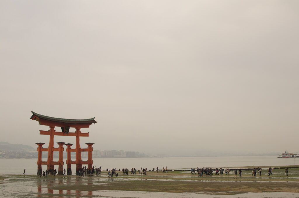 厳島神社の鳥居を三分割左下の交点に置いており、水平で砂浜、海、空と画面を分割しているが、画面の80%を空が占めている。この広大な何もないスペースが、先述べた、ネガティブ・スペースである。惜しむらくは水平線の向こうに街が見えることである。極端なほどに空が占めるこの構図は、厳島神社という有形物を画面に収めることによって、むしろ広大な余白や空白を描くことを目論んでいる。この莫大なネガティブ・スペースには、なにもないわけではなく、薄雲の広がる空が存在している。あえて空と雲をグレーのトーンに落とすことによって、彩度の高い鳥居との対比をなしており、遠景としてのネガティブ・スペースと、近景の鳥居や砂浜との存在感のバランスを保っている。