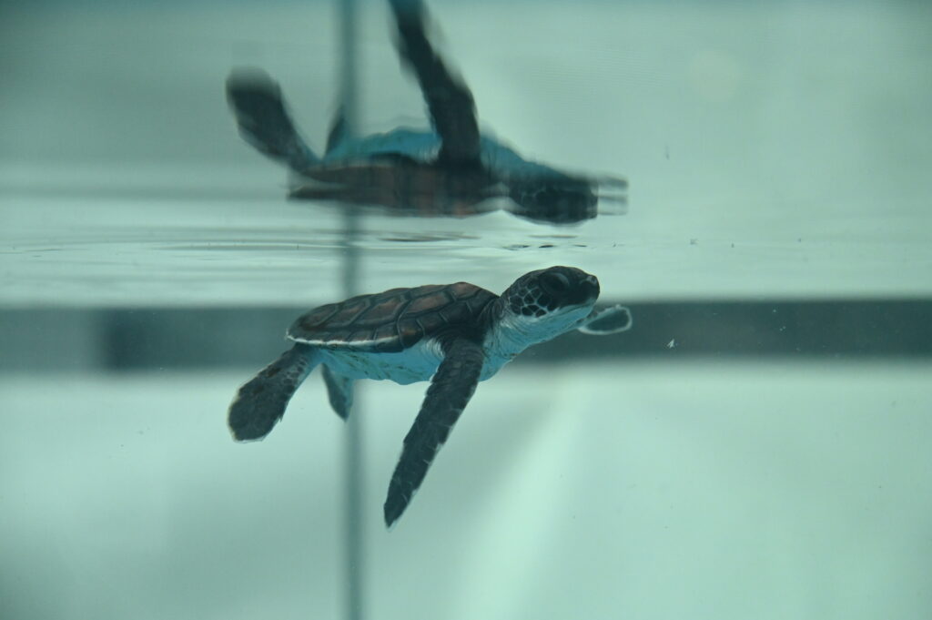 反射像は鏡像であり、子ガメが自己像と向き合っているかのようである。実際にはそんなことはなく、子ガメは息を吸いに水面に上がってきただけである。しかしここには、鏡像がある。それはすなわち、現実に生きているという子ガメの強烈なまでの存在感を感じさせている。