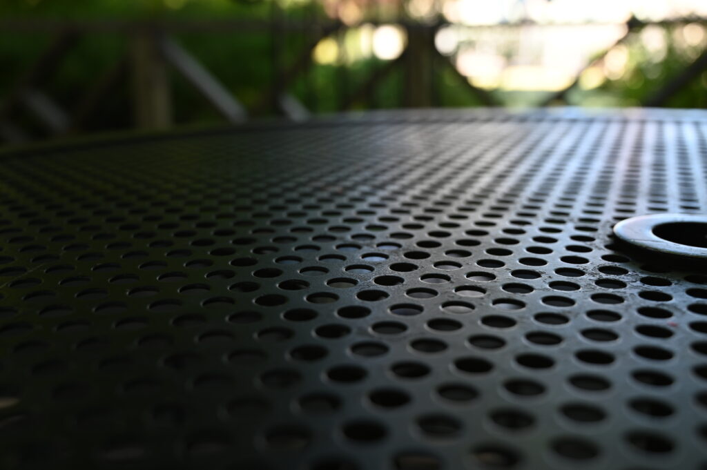 それでも写真の大部分が均一な穴の反復によって構成されていることから、リズミカルな運動を感じさせるところがある。しかし奥に進むほど焦点が失われるため、またテーブル平面に対して鋭角からの撮影によって奥の穴と手前の穴の同質性が崩れるため、リズムは次第に曖昧になる。この曖昧さが、メルロ=ポンティ的には、知覚の揺らぎを生み、自分たちの知覚の不確実性に気付かせることになる。見えているのは実在の物体としての鉄のテーブルであるが、その物質としての全体性を撮影しているのではなく、奥行きという距離そのものを切り出している。もしテーブル全体にピントが合っていると、テーブルの物質性を強調することになり、曖昧さが失われることになる。それはそれで別の体験を与えるだろうが、この写真では前後のボケが物理的な連続性を一部損なうことを通して、知覚の揺らぎを冷たく、硬く、しかし柔らかに表現している。