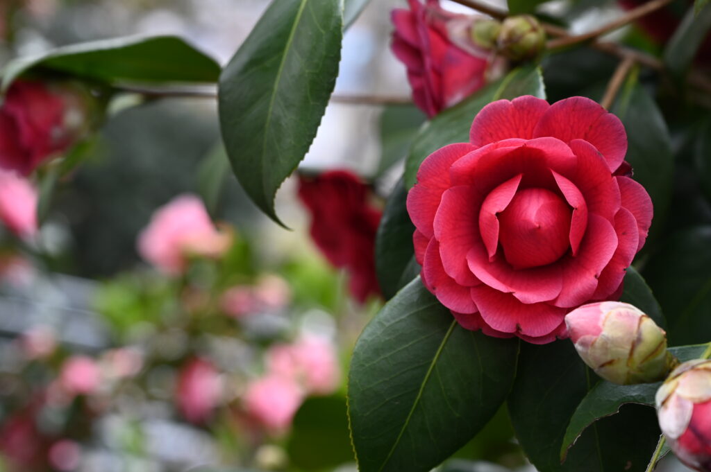 被写界深度は浅く、椿の花弁にのみピントが合っており、三分割構図そのままの写真である。背景はやわらかなボケによって、鮮明な像は結ばないものの、色彩によって花や葉や枝の存在感を与え、主題と背景を色彩的に共鳴させている。写真自体は、深い紅と緑、そして陰影によって暗く抑えられており、椿という浮き足立たない花のキャラクタが表現されている。花にピントが合うことによって、椿の花が螺旋状についているという構造が明確になり、この螺旋という秩序立ったリズムとともに、この椿のことを所有するという空想がもたらされる。